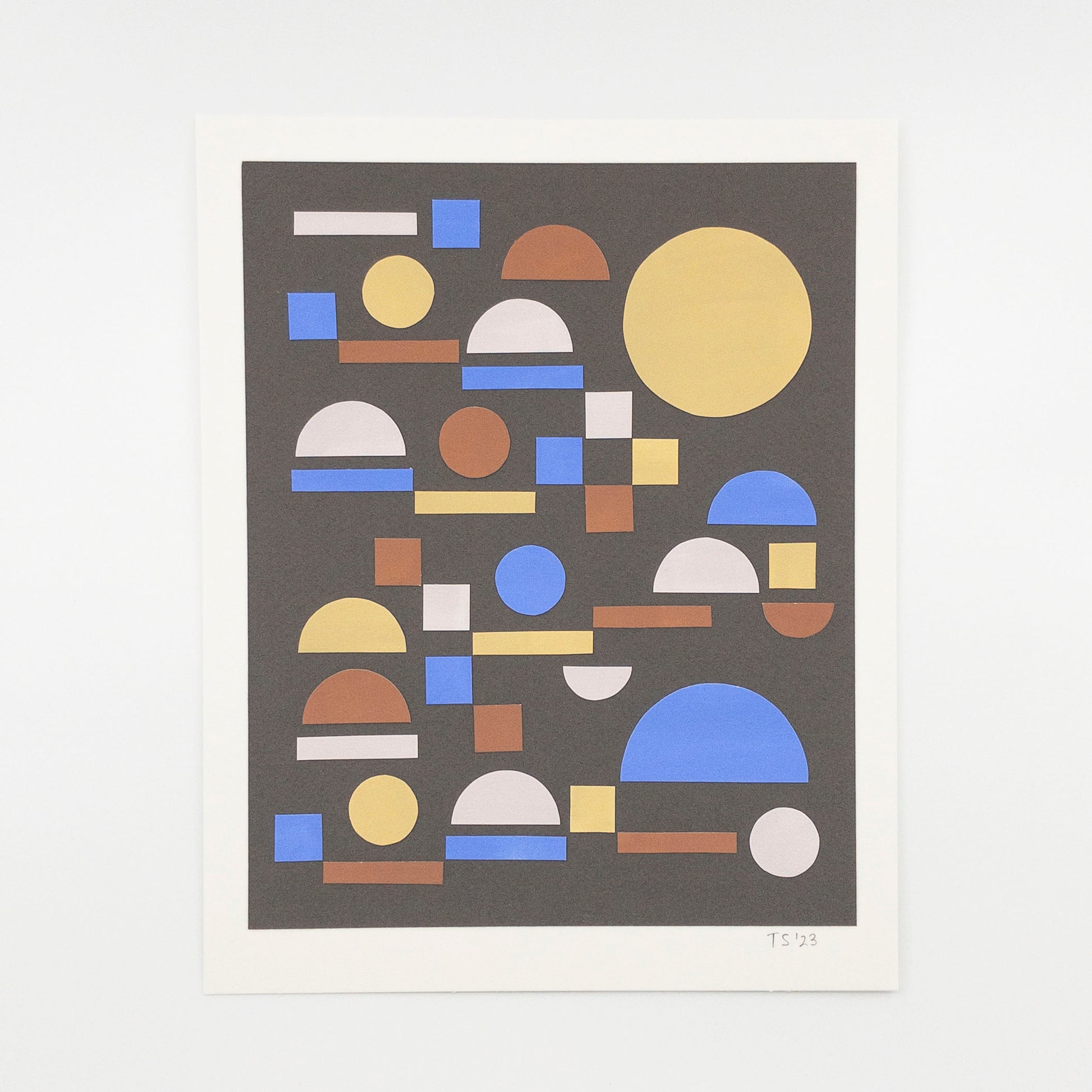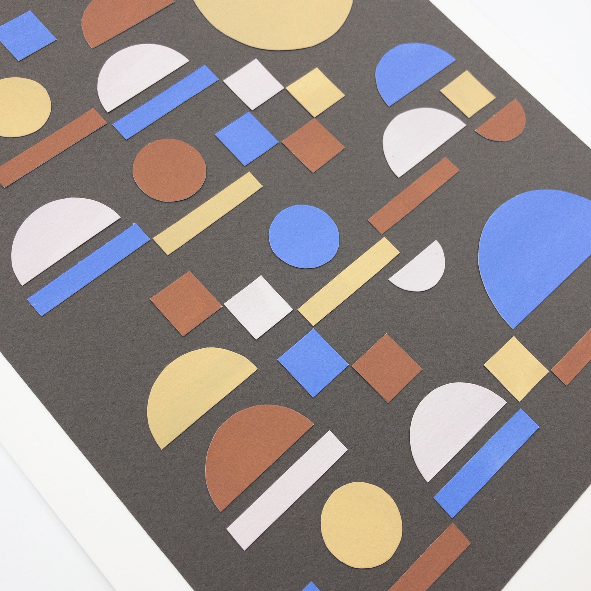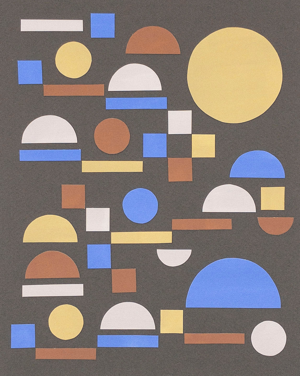 Hand-painted paper cutout shapes in cornflower blue, rust red, light yellow, and pale lilac on a gray background. The arrangement reminds me of an orderly city layout.