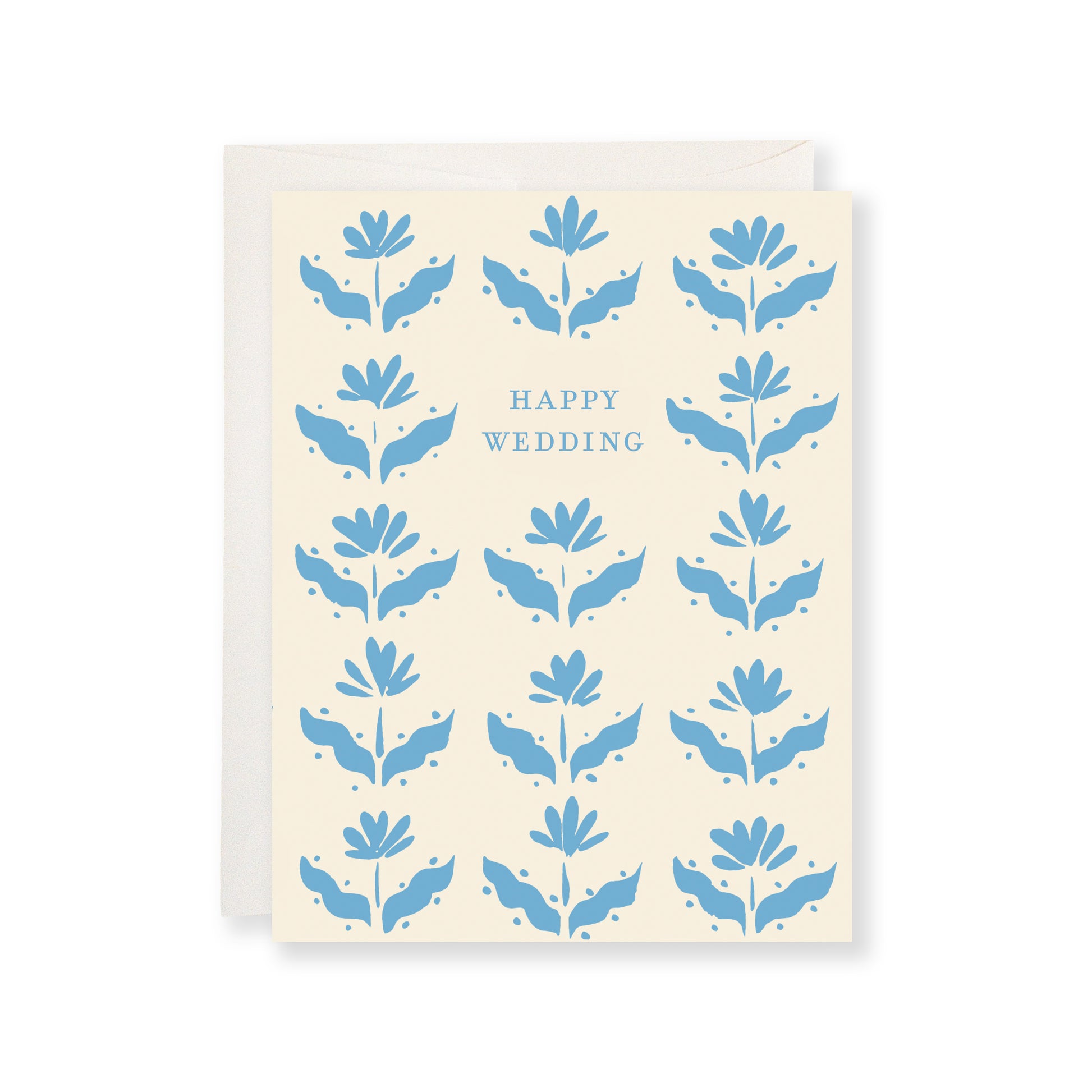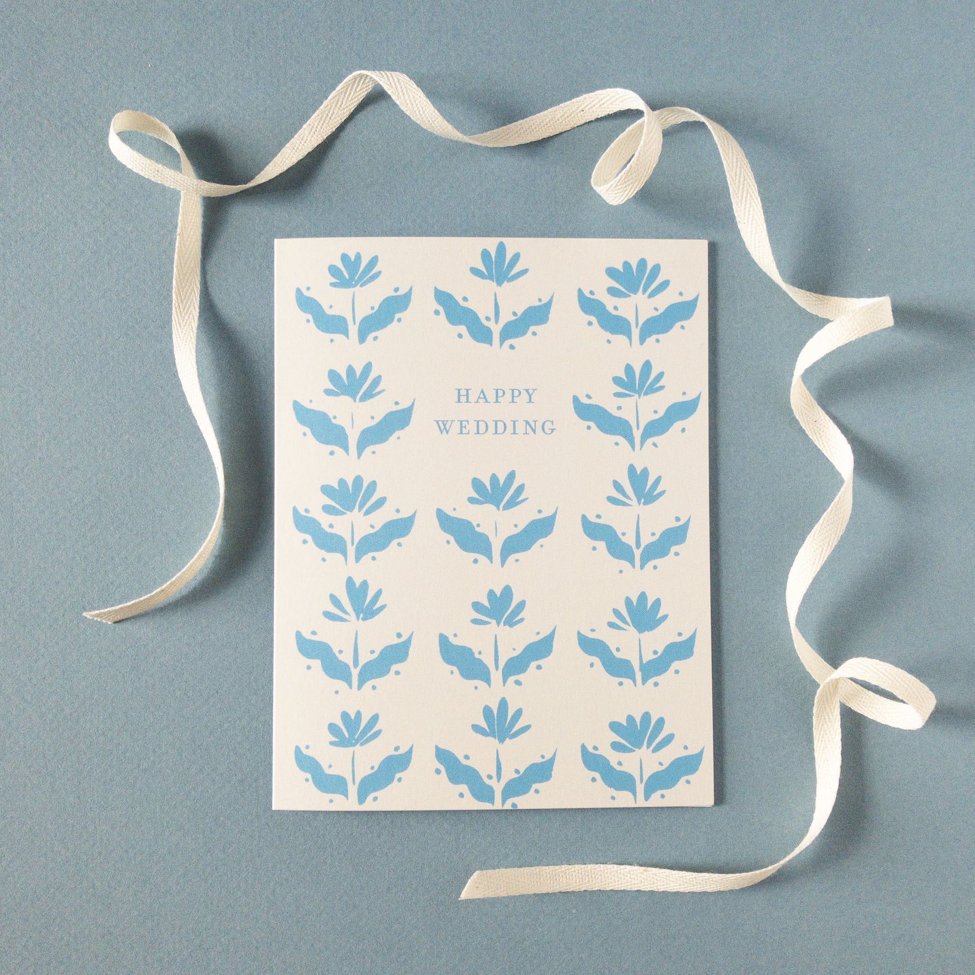 This wedding greeting card features a hand-drawn abstract floral pattern in bright blue on a cream background. The front of the card says "Happy wedding".