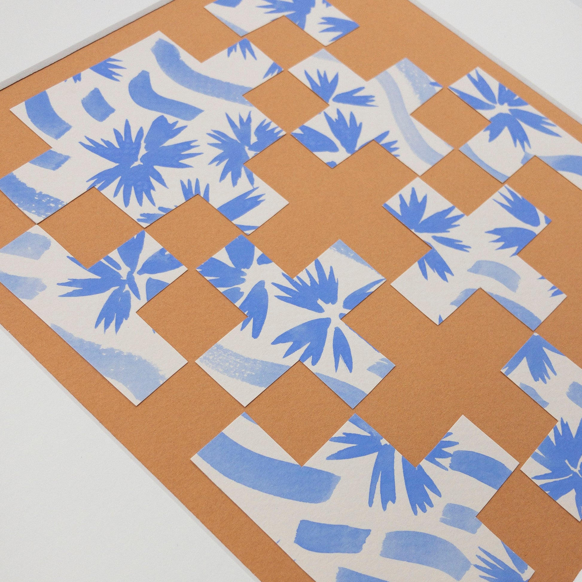 Patterns on patterns! Painted cornflowers cut out in a tetris-inspired pattern.