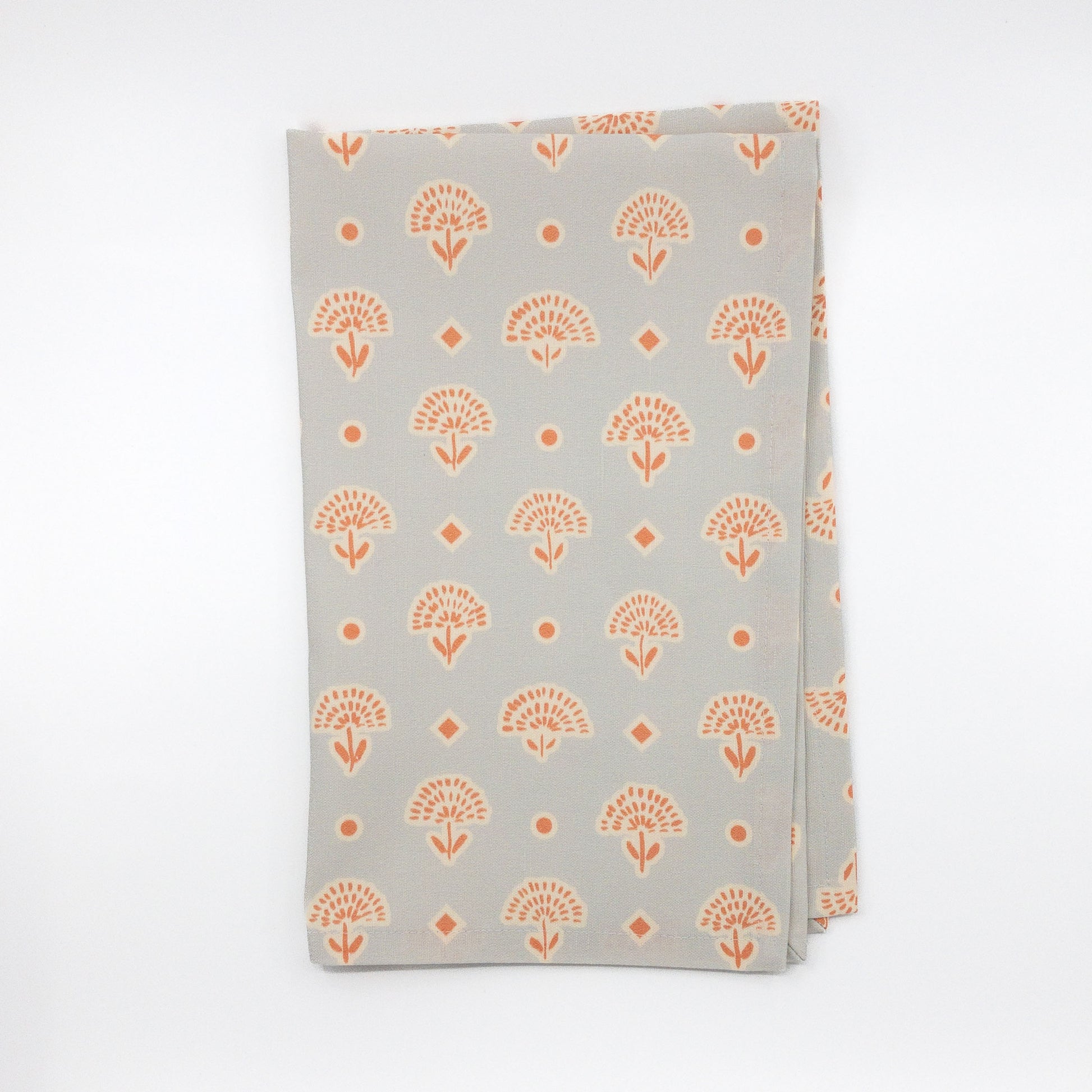This tea towel features hand-drawn flowers reminiscent of frilly marigolds, in a red rust and blue grey color palette.
