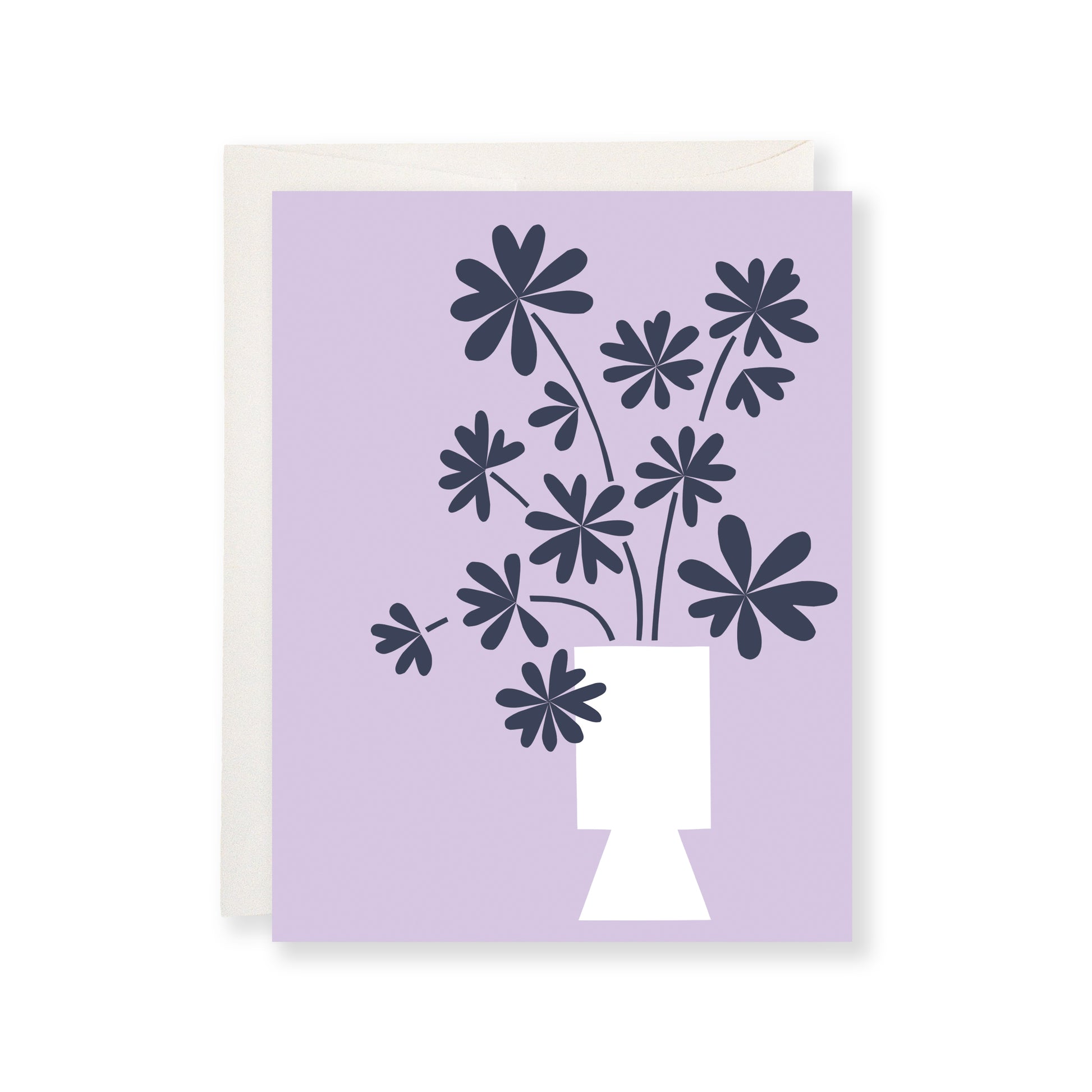 This blank floral card features a geometric vase filled with navy blooms on a lilac background. The original artwork began as hand-cut paper shapes, arranged petal by petal and stem by stem to create a balanced composition.