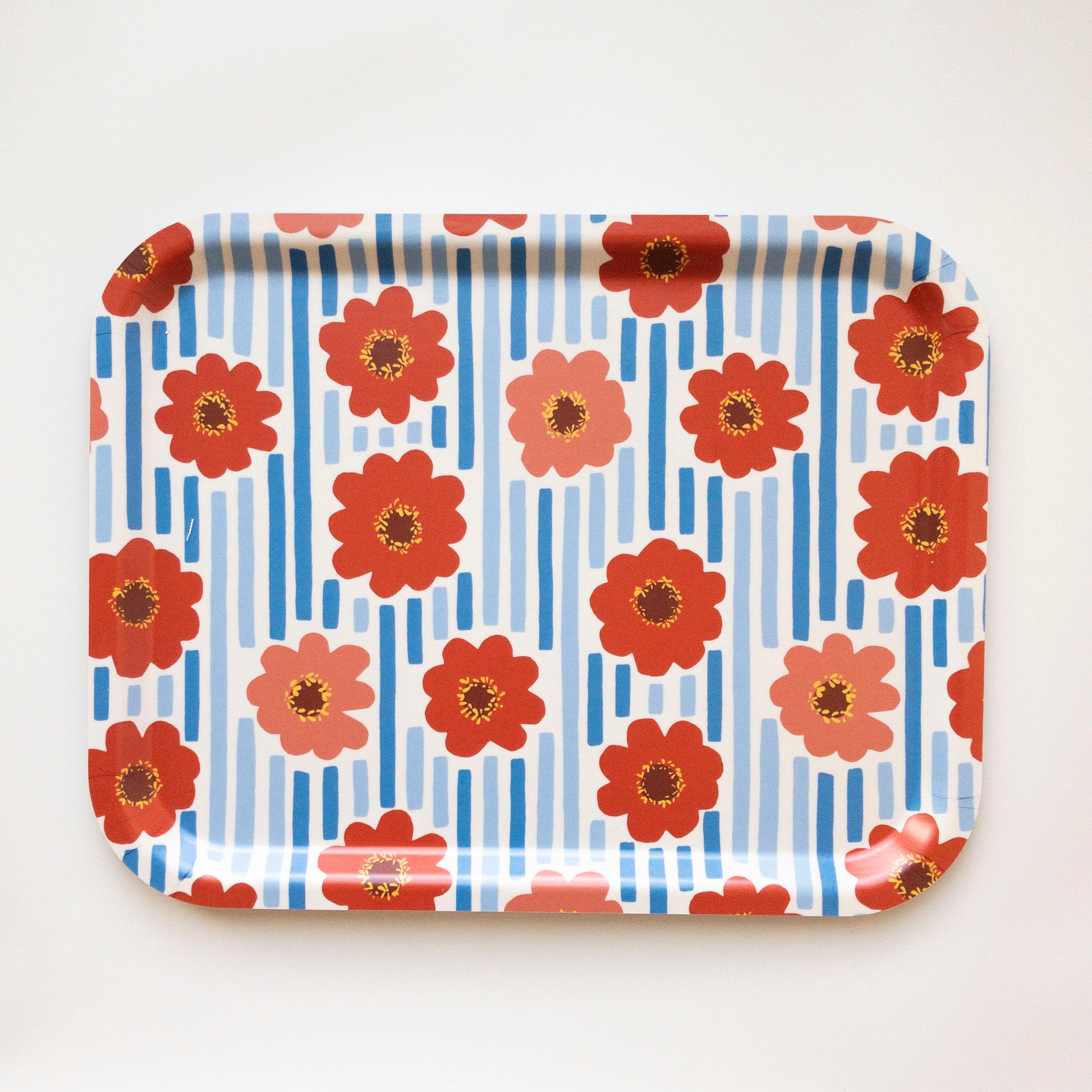 Birch veneer tray featuring bright coral and orangey red zinnias surrounded by blue stripes. Around the center of each flower are delicate inner flowers – my favorite feature of zinnias.